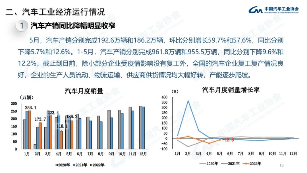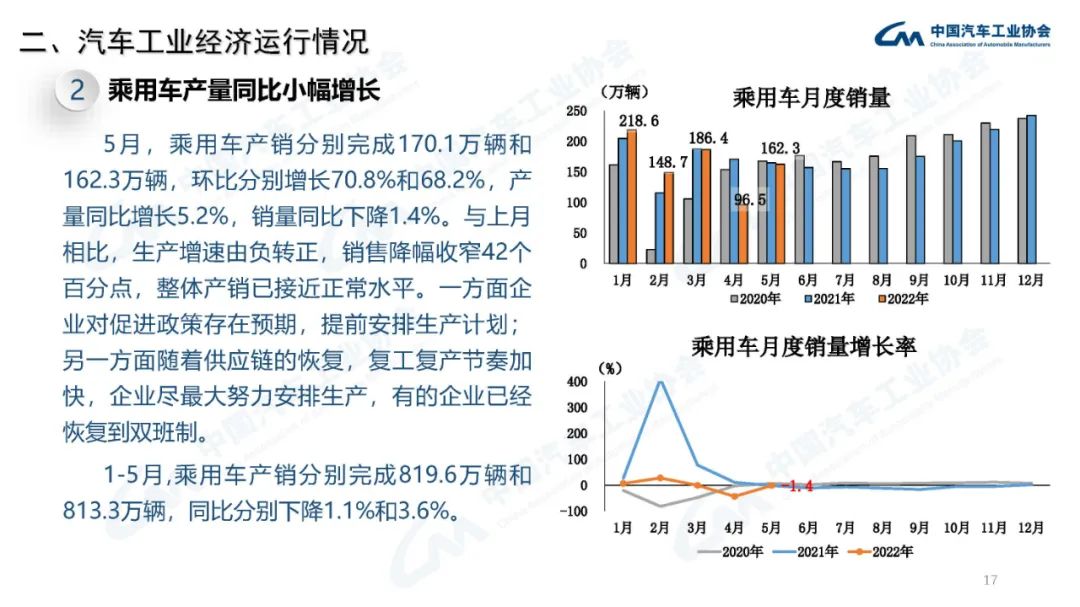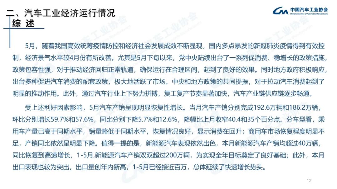 受利好因素影響,5月汽車(chē)產(chǎn)銷(xiāo)呈現(xiàn)明顯恢復(fù)性增長(zhǎng)。乘用車(chē)產(chǎn)量已高于同期水平,銷(xiāo)量略低于同期水平,恢復(fù)情況良好;商用車(chē)市場(chǎng)恢復(fù)程度明顯不足,產(chǎn)銷(xiāo)同比依然呈明顯下降。新能源汽車(chē)表現(xiàn)依然出色。本月出口表現(xiàn)也較為突出,出口量創(chuàng)年內(nèi)新高。