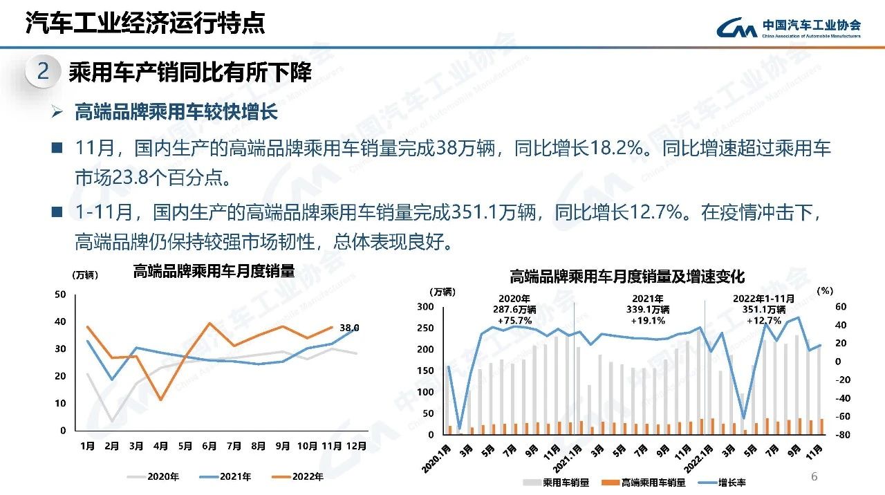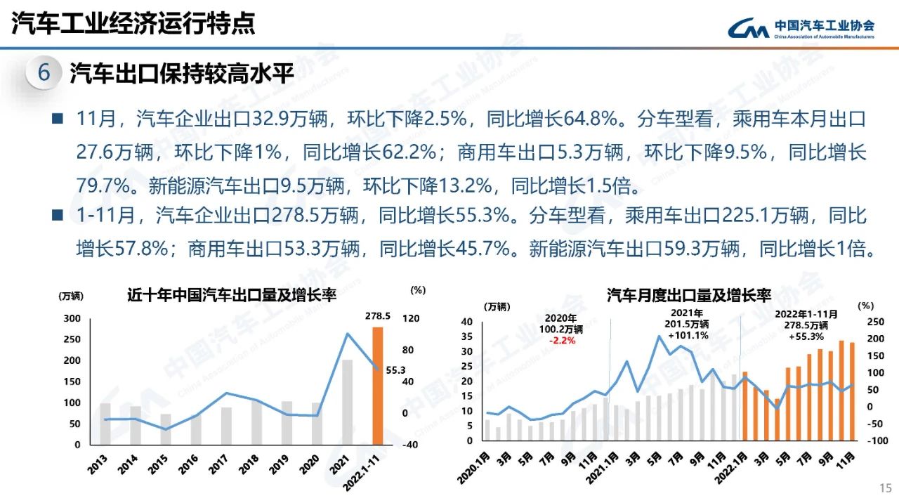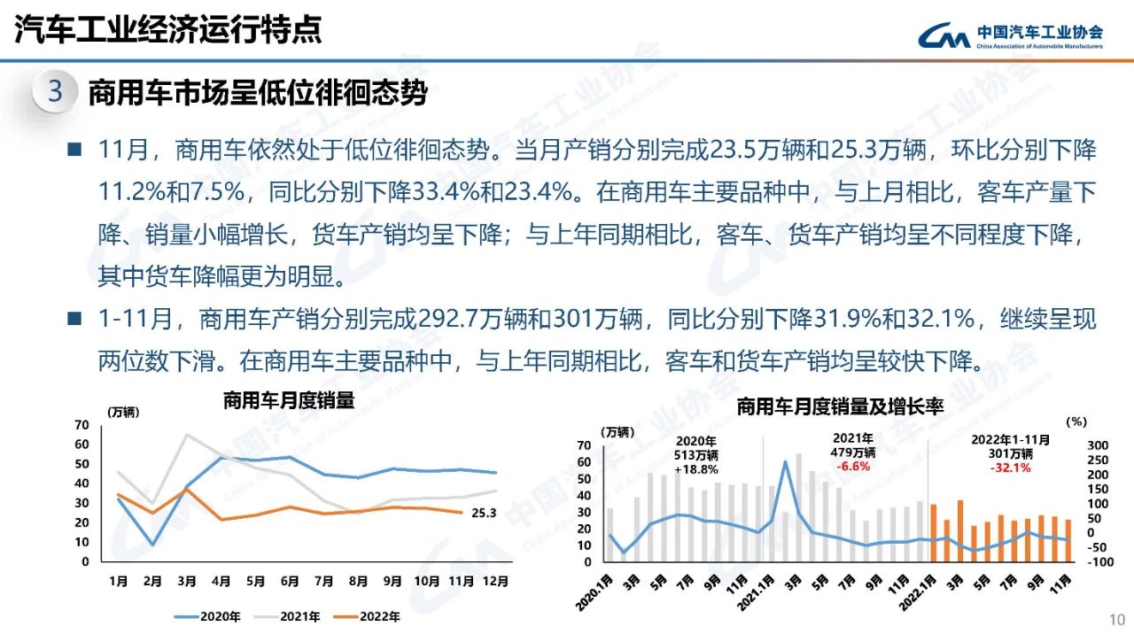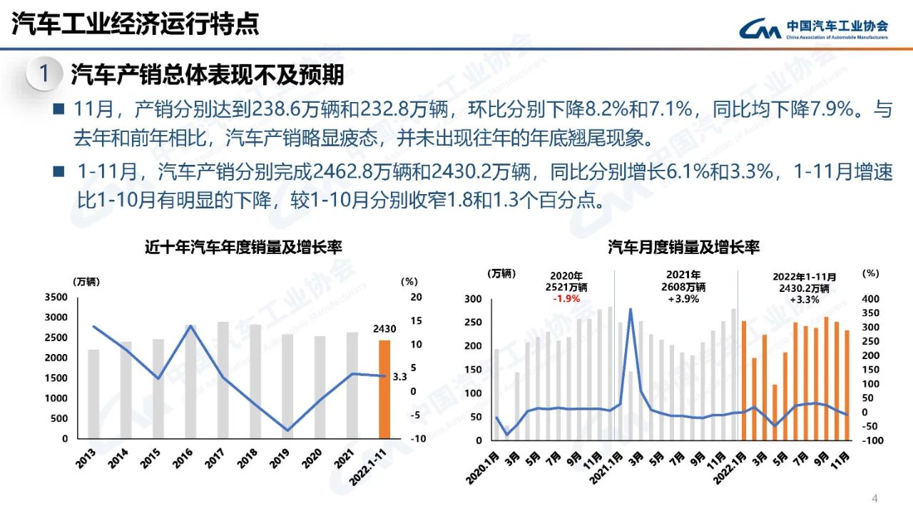 據(jù)中國汽車工業(yè)協(xié)會統(tǒng)計(jì)分析,2022年11月,汽車產(chǎn)銷略顯疲弱,環(huán)比、同比均呈現(xiàn)下降,下行趨勢明顯,總體表現(xiàn)不及預(yù)期。