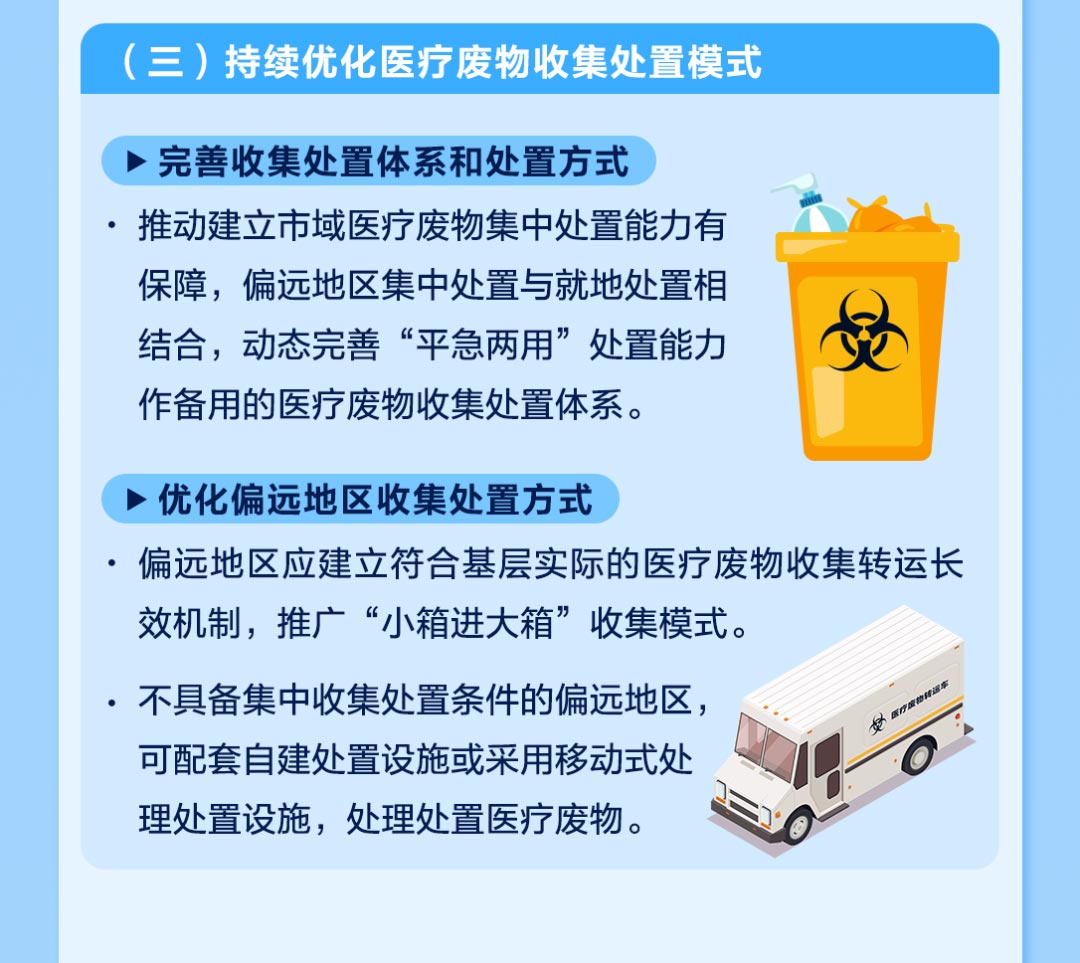 在醫(yī)療廢物收集處置方面,指導(dǎo)意見(jiàn)提出,推動(dòng)建立市域醫(yī)療廢物集中處置能力有保障、偏遠(yuǎn)地區(qū)集中處置與就地處置相結(jié)合、動(dòng)態(tài)完善“平急兩用”處置能力作備用的醫(yī)療廢物收集處置體系。繼續(xù)推行醫(yī)療廢物集中無(wú)害化處置。