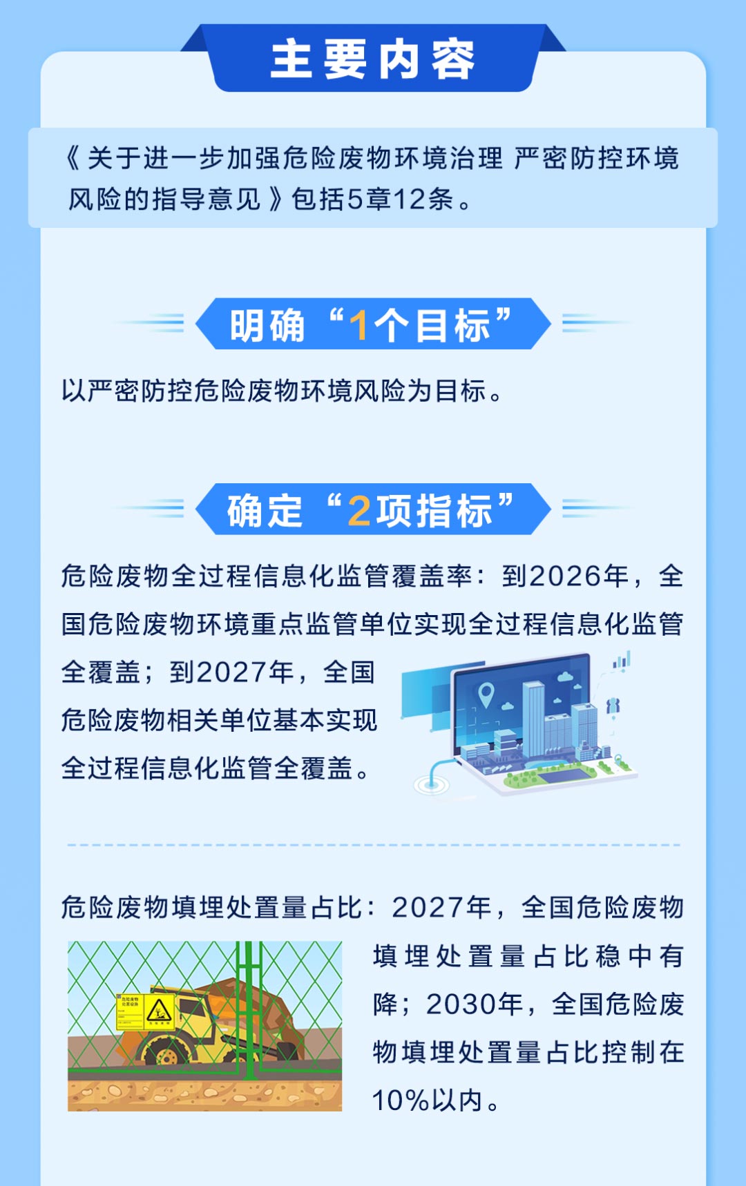 指導(dǎo)意見(jiàn)提出,到2026年,全國(guó)危險(xiǎn)廢物環(huán)境重點(diǎn)監(jiān)管單位實(shí)現(xiàn)全過(guò)程信息化監(jiān)管全覆蓋。到2027年,全國(guó)危險(xiǎn)廢物相關(guān)單位基本實(shí)現(xiàn)全過(guò)程信息化監(jiān)管全覆蓋,危險(xiǎn)廢物填埋處置量占比穩(wěn)中有降,利用處置保障能力和環(huán)境風(fēng)險(xiǎn)防控水平進(jìn)一步提升。到2030年,危險(xiǎn)廢物全過(guò)程信息化監(jiān)管體系進(jìn)一步完善,全國(guó)危險(xiǎn)廢物填埋處置量占比控制在10%以內(nèi),危險(xiǎn)廢物環(huán)境風(fēng)險(xiǎn)得到有效防控。