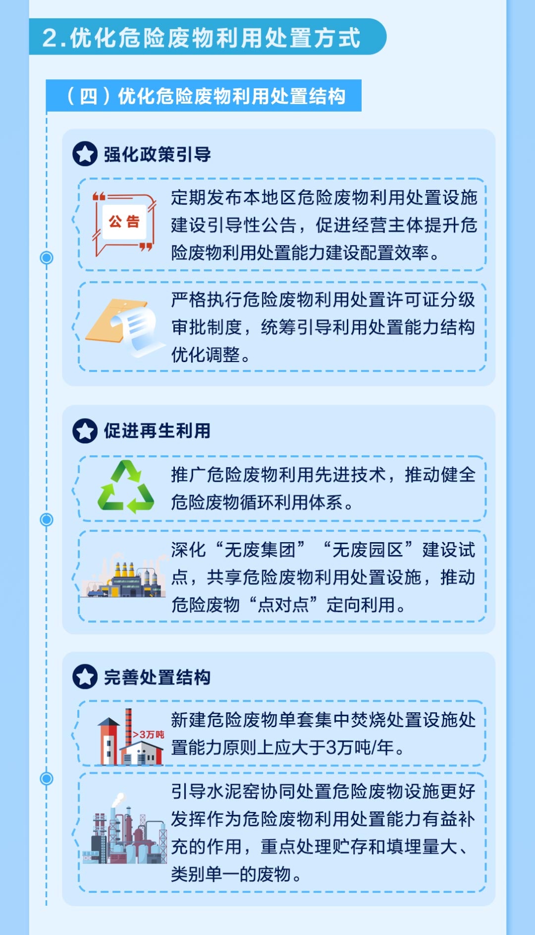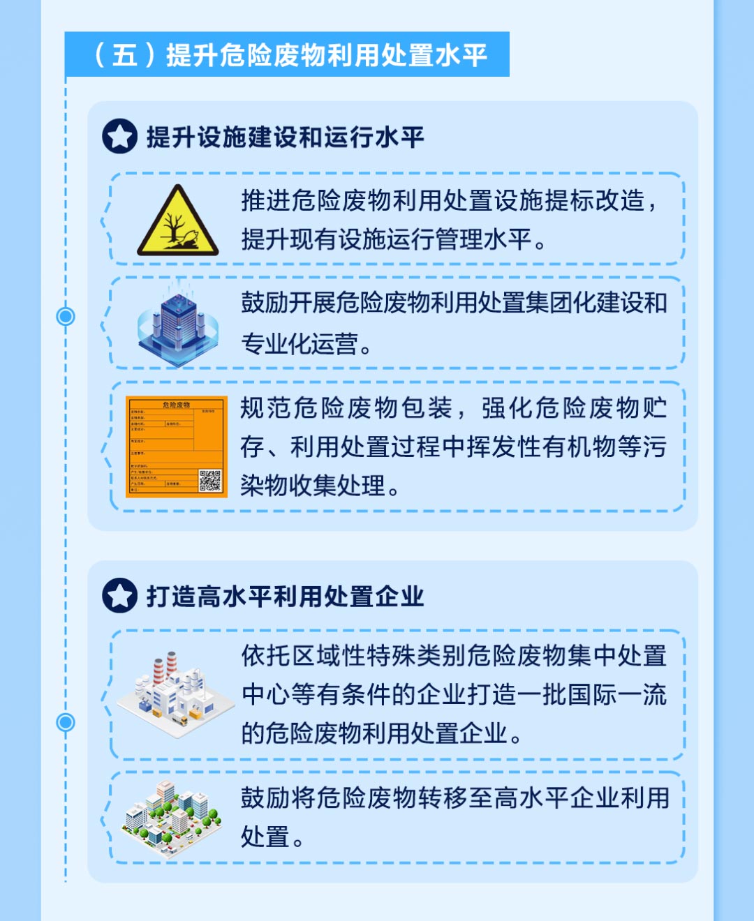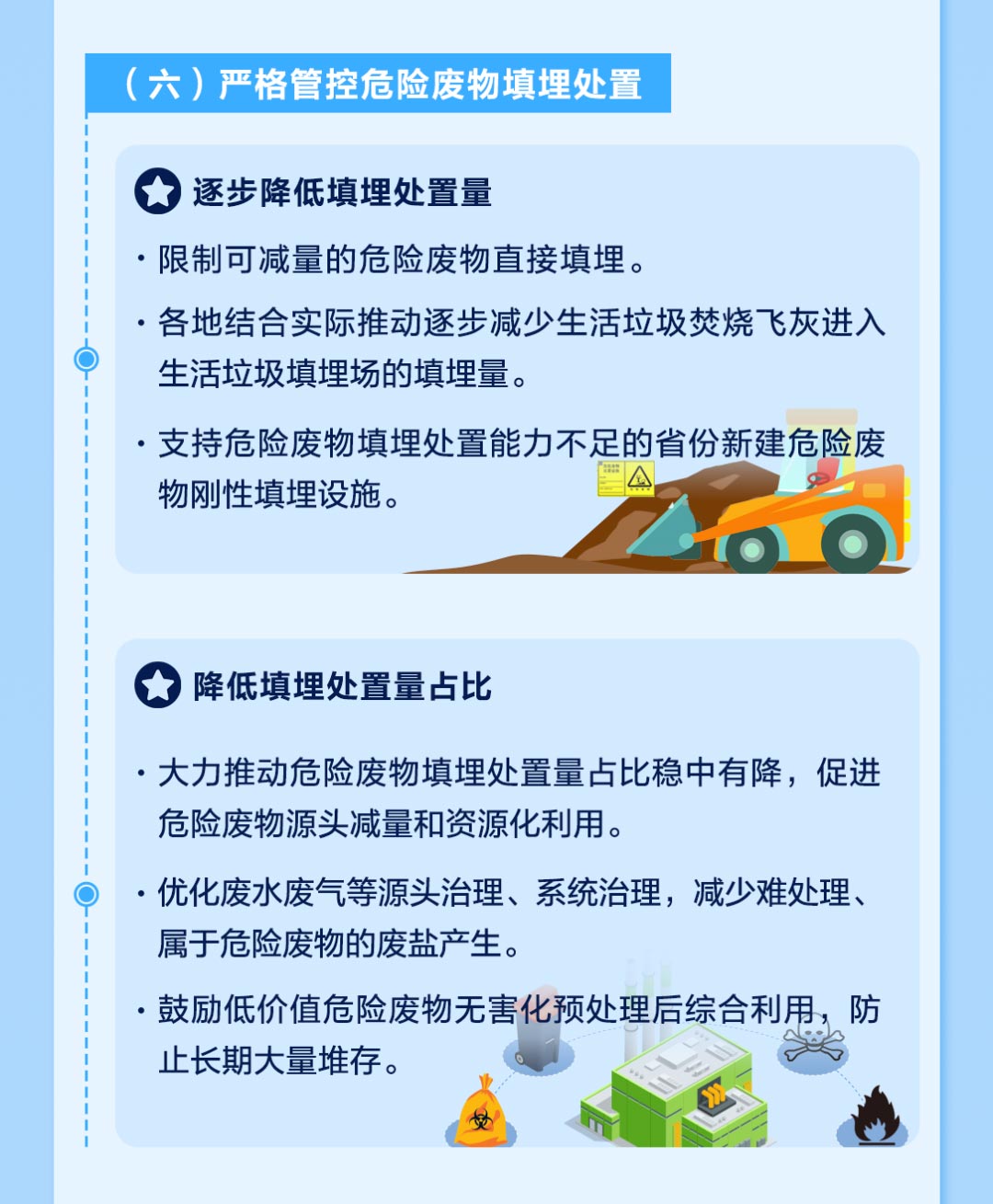 在嚴(yán)格管控危險(xiǎn)廢物填埋處置方面,指導(dǎo)意見(jiàn)要求,逐步降低填埋處置量。強(qiáng)化環(huán)境監(jiān)管,逐步限制通過(guò)利用、焚燒等處理方式可減量的危險(xiǎn)廢物直接填埋。同時(shí),大力推動(dòng)危險(xiǎn)廢物填埋處置量占比穩(wěn)中有降,促進(jìn)危險(xiǎn)廢物源頭減量和資源化利用。